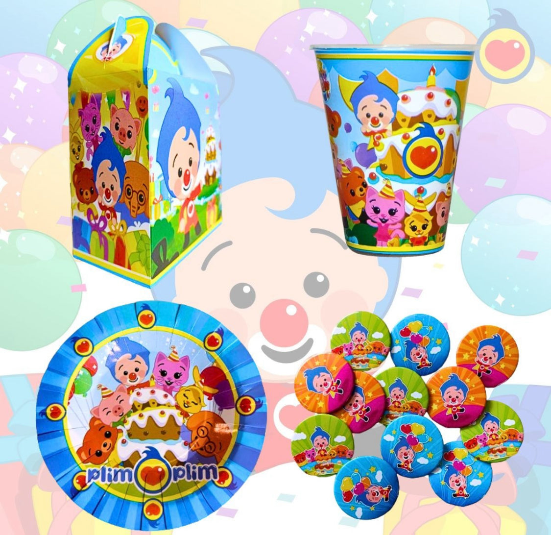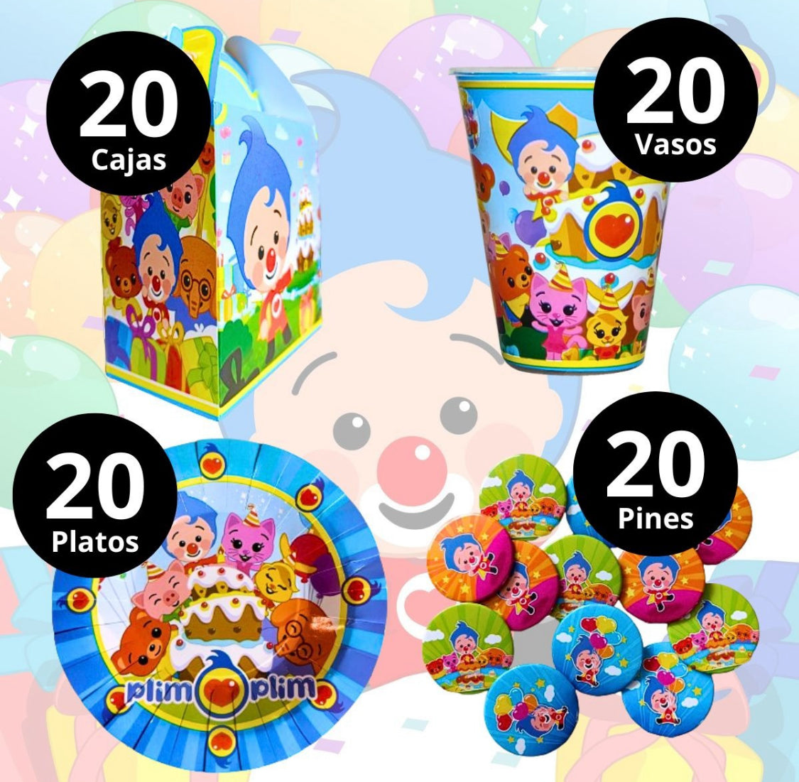 20 Guests Invitados Party Kit 80 Pcs. Vasos, Platos Dulceros y Broches Payasito